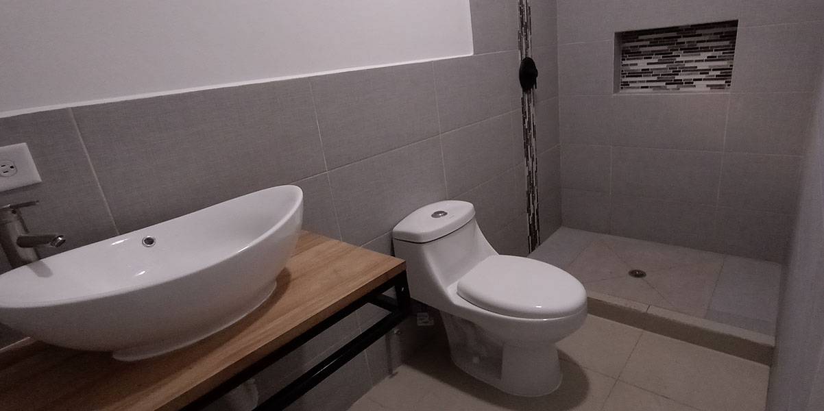 Para tu comodidad, hemos incorporado un nicho o jabonera en la zona de la ducha, para que tengas tus productos de baño siempre a la mano. Además, los lavamanos son de sobreponer o empotrados sobre un fijo en voladizo, según tu elección lo que le da un toque moderno y minimalista al baño.