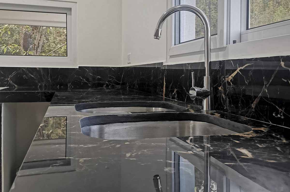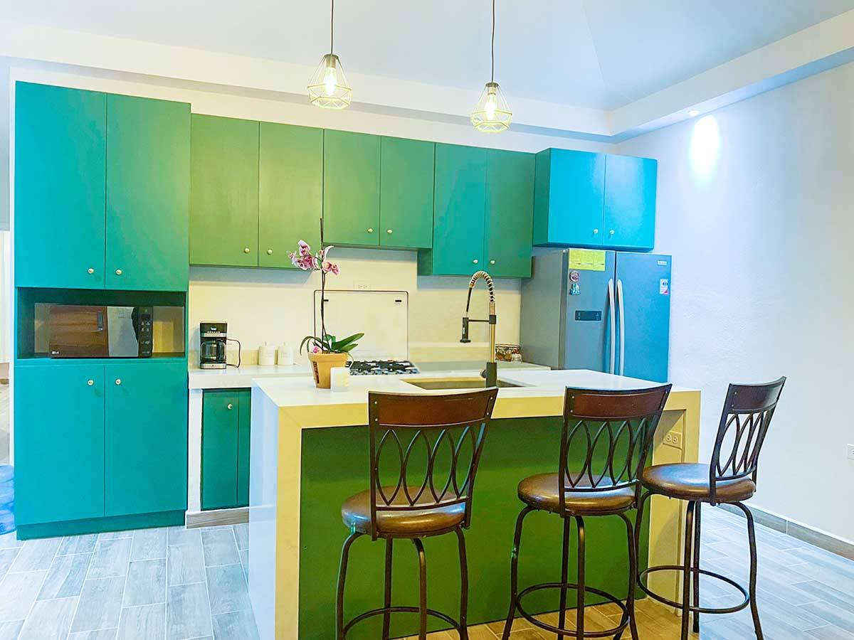 Las lámparas decorativas son una ampliación que complementa el diseño moderno y elegante de tu cocina. Además, hemos instalado un lavatrastos de doble fosa profunda con su grifo, para garantizar que la limpieza de su cocina sea rápida y eficiente.